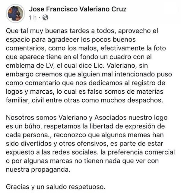 El abogado identificado como José Francisco Valeriano Cruz aclaró que en realidad su despacho se llama Valeriano Abogados y se dedica a casos de materia civil y familiar, pero alguien malintencionado uso su foto para decir que se dedican al registro de marcas.