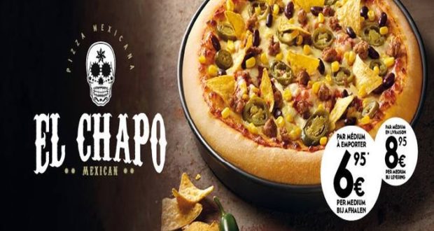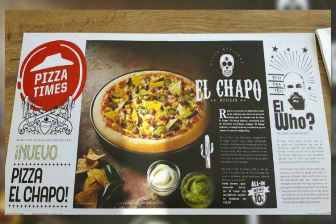 Pizza Hut Bélgica sacó a la venta una pizza llamada 'El Chapo' con ingredientes característicos de la comida mexicana como: carne molida picante, nachos, chile y frijoles.