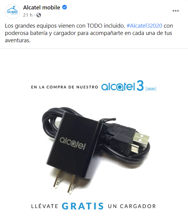 "Los grandes equipos vienen con TODO incluido. #Alcatel32020 con poderosa batería y cargador para acompañarte en cada una de tus aventuras", escribieron en una publicación de Facebook con más de mil reacciones.