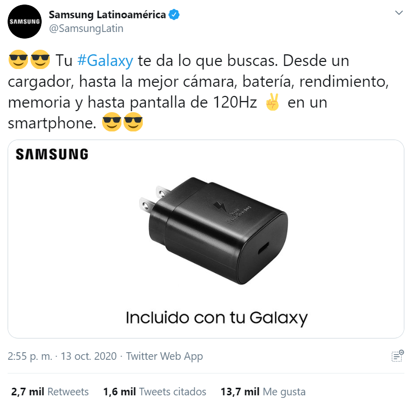 "Tu #Galaxy te da lo que buscas. Desde un cargador, hasta la mejor cámara, batería, rendimiento, memoria y hasta pantalla de 120Hz Mano de victoria en un smartphone. Cara sonriente con lentes de solCara sonriente con lentes de sol", compartió Samsung en un tuit que ya lleva más de 13 mil likes.