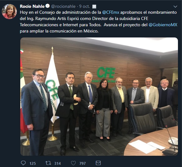 Fue a través del Consejo de Administración de la Comisión Federal de Telecomunicaciones (CFE), quien aprobó el nombramiento de Raymundo Artís Espriú como director de la nueva subsidiaria de la comisión, Telecomunicaciones e Internet para Todos, señaló la secretaria de Energía, Rocío Nahle. El encargado de competirle a Slim o Zuckerberg, Artís Espriú, fue el encargado de llevar a cabo la coordinación de la Estrategia Digital Nacional, el cual elaboraba y aplicaba las normas de los sistemas digitales del gobierno federal, así como del proyecto para conectar y comunicar el territorio nacional mediante Internet."Hoy en el Consejo de administración de la CFE aprobamos el nombramiento del Ing. Raymundo Artís Espriú como Director de la subsidiaria CFE Telecomunicaciones e Internet para Todos. Avanza el proyecto del gobierno para ampliar la comunicación en México", señalo Nahle a través de su cuenta de Twitter.
