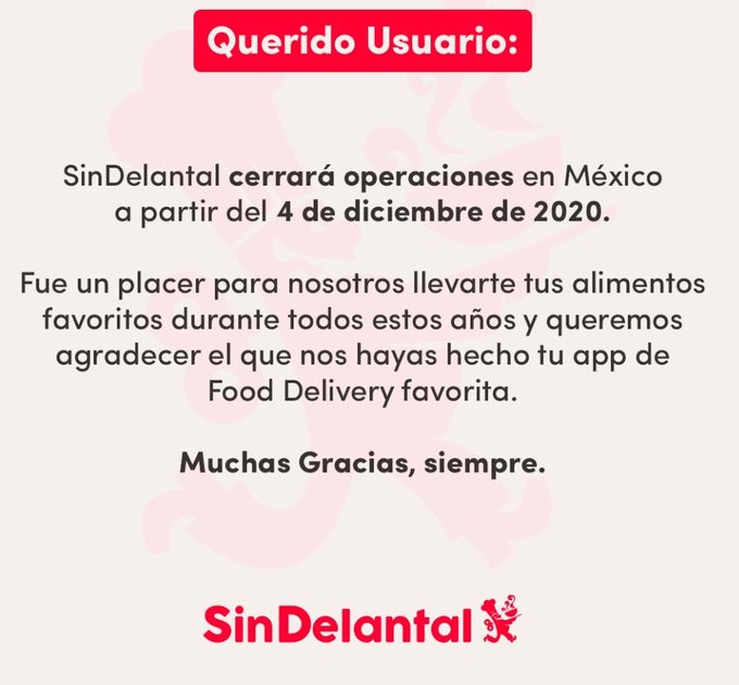 La compañía de delivery de alimentos, Sin Delantal, se despidió de sus usuarios y anunció que se ira de México a partir del 4 de diciembre de 2020.