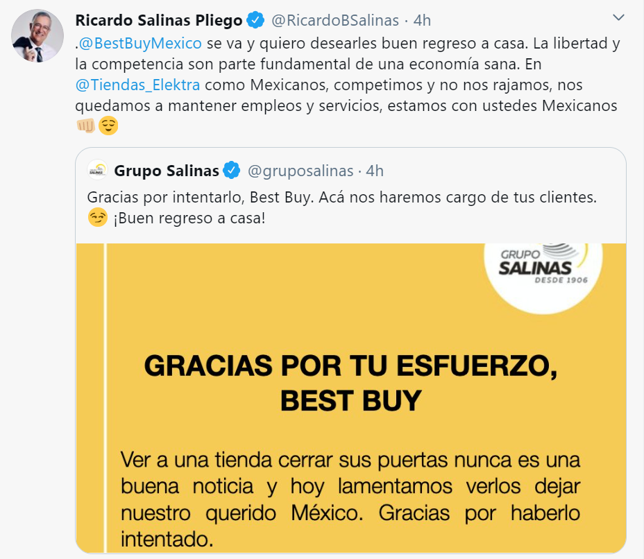 "Best Buy se va y quiero desearles buen regreso a casa. La libertad y la competencia son parte fundamental de una economía sana. En Elektra como Mexicanos, competimos y no nos rajamos, nos quedamos a mantener empleos y servicios, estamos con ustedes mexicanos", escribió Salinas Pliego.