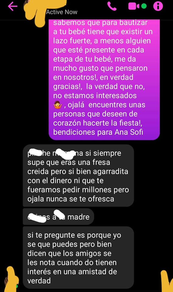 Ante la incredulidad de los mensajes, Gabriela le preguntó varias veces a su amiga si era una broma, pero al ver que era verdad rechazó la oferta y le deseo suerte para encontrar a otros padrinos. La amiga de Gabriela no se tomó bien que no aceptarán la oferta y terminó insultándola por mensaje."Siempre supe que eras una fresa creída pero si bien agarradita con el dinero ni que te fuéramos a pedir millones, pero ojalá nunca se te ofrezca", le puso en uno de los últimos mensajes.