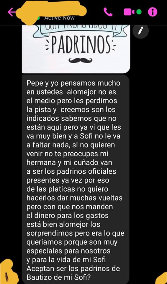 "Creemos que son los indicados, sabemos que no están aquí pero ya vi que les va muy bien y a Sofi no le va a faltar nada, si no quieren venir no te preocupes, mi hermana y mi cuñado van a ser los padrinos oficiales presentes", se lee en el mensaje.