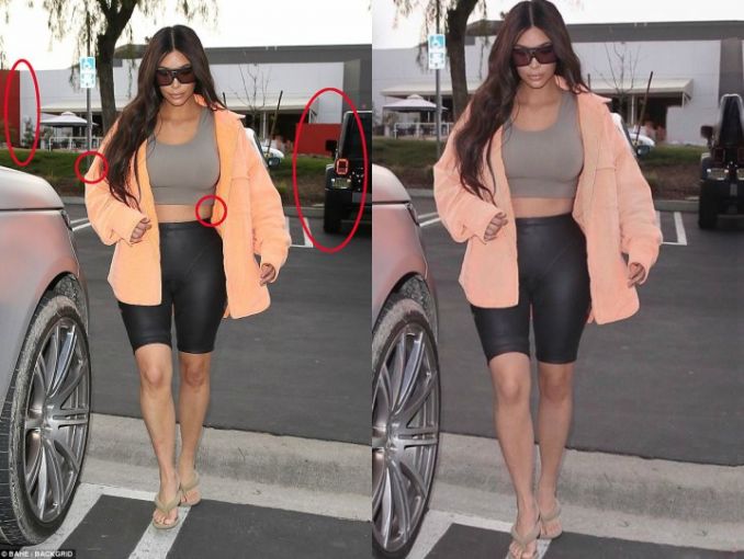 Kim Kardashian compartió una fotografía en su Instagram donde aparece un auto deformado en el fondo, usuarios encontraron la foto original y se dieron cuenta que se había editado la cintura, pero el resto de la imagen también se modificó.