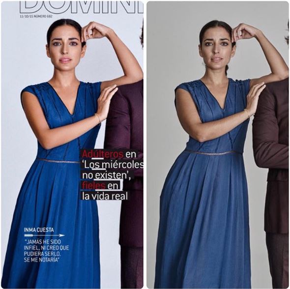 La actriz española Inma Cuesta denunció en sus redes sociales que entendía la edición para resaltar los colores, pero no que hubieran editado su cuerpo hasta dejarla casi a "la mitad de lo que es".