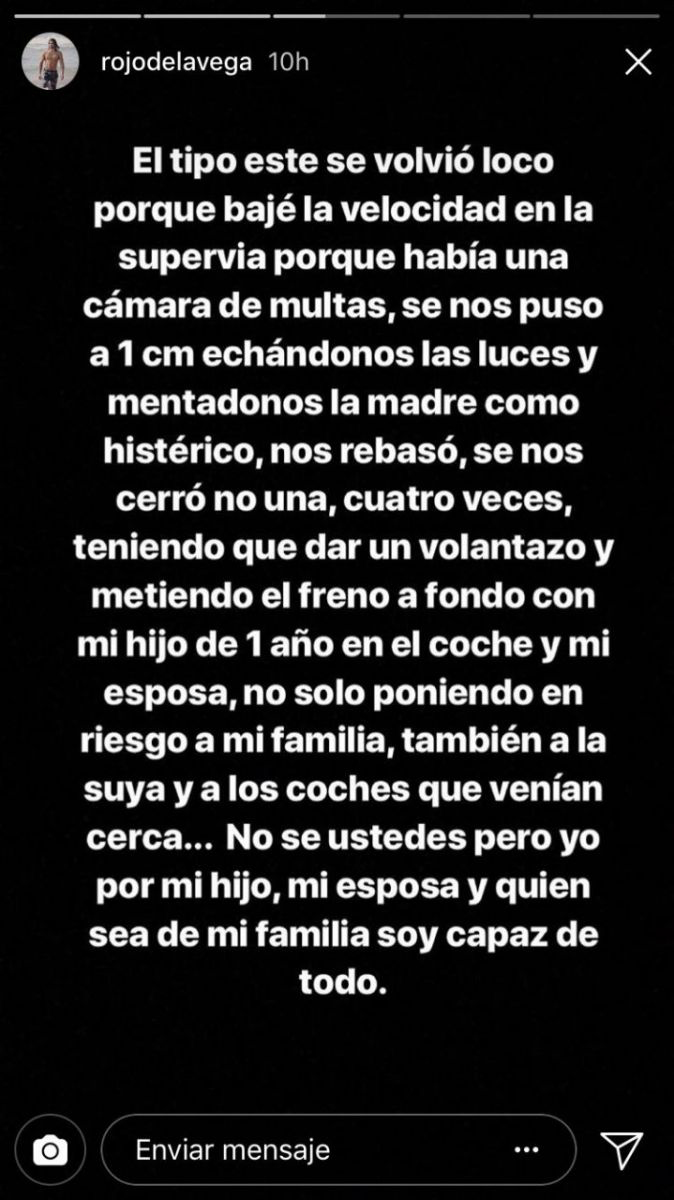 A través de sus historias de Instagram, Gabriel dio su versión de los hechos y dijo que fue el conductor del otro auto quien "se nos puso a 1 cm echándonos las luces y mentándonos la madre como histérico, nos rebasó, se nos cerró no una, cuatro veces".