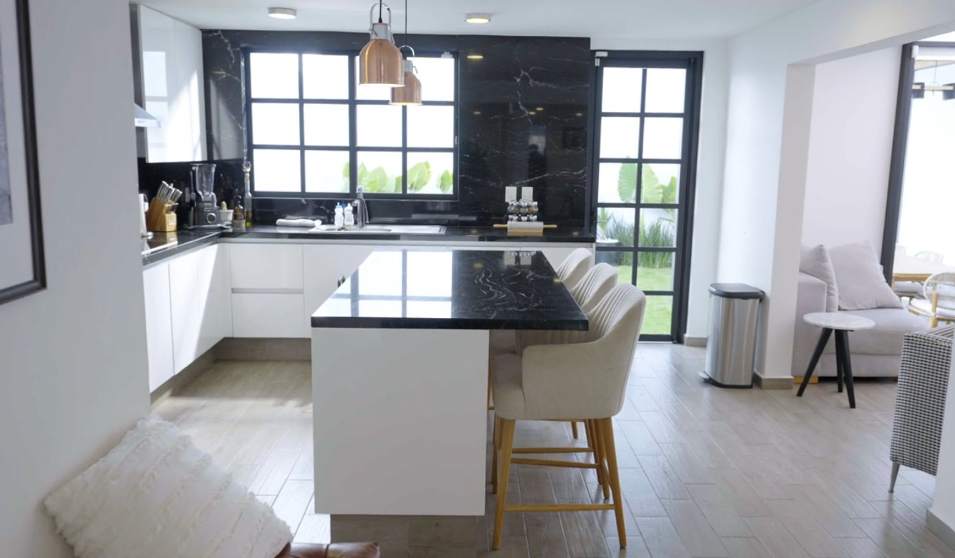 La cocina es otro de los espacios que más destaca dentro de la vivienda. Se trata de un área amplia con diseño minimalista, en la que predominan superficies blancas combinadas con cubiertas negras y una isla central que funciona como punto de reunión.