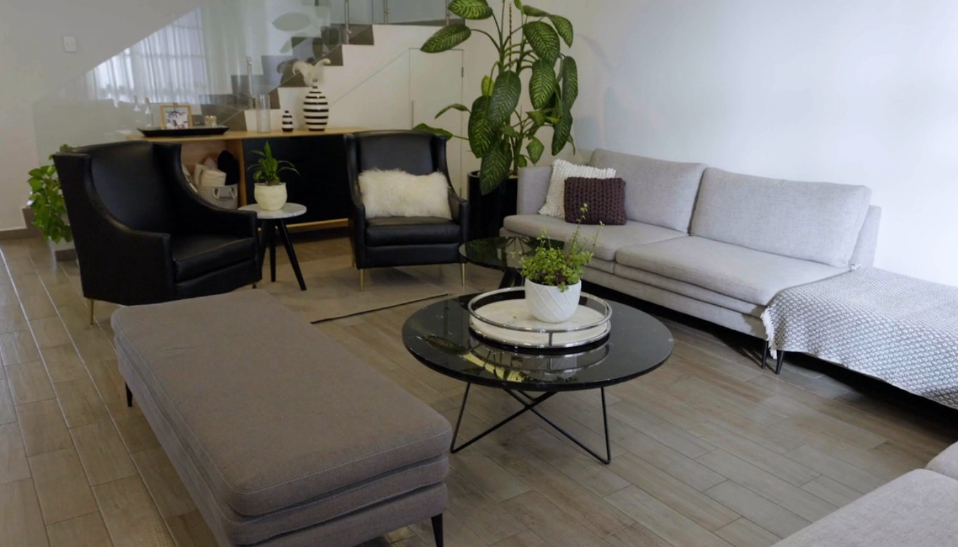 La sala principal refleja el estilo sobrio de la casa, con sillones en tonos grises, una mesa de centro de cristal y detalles decorativos discretos, como plantas y cojines que aportan un ambiente acogedor sin perder la estética moderna.