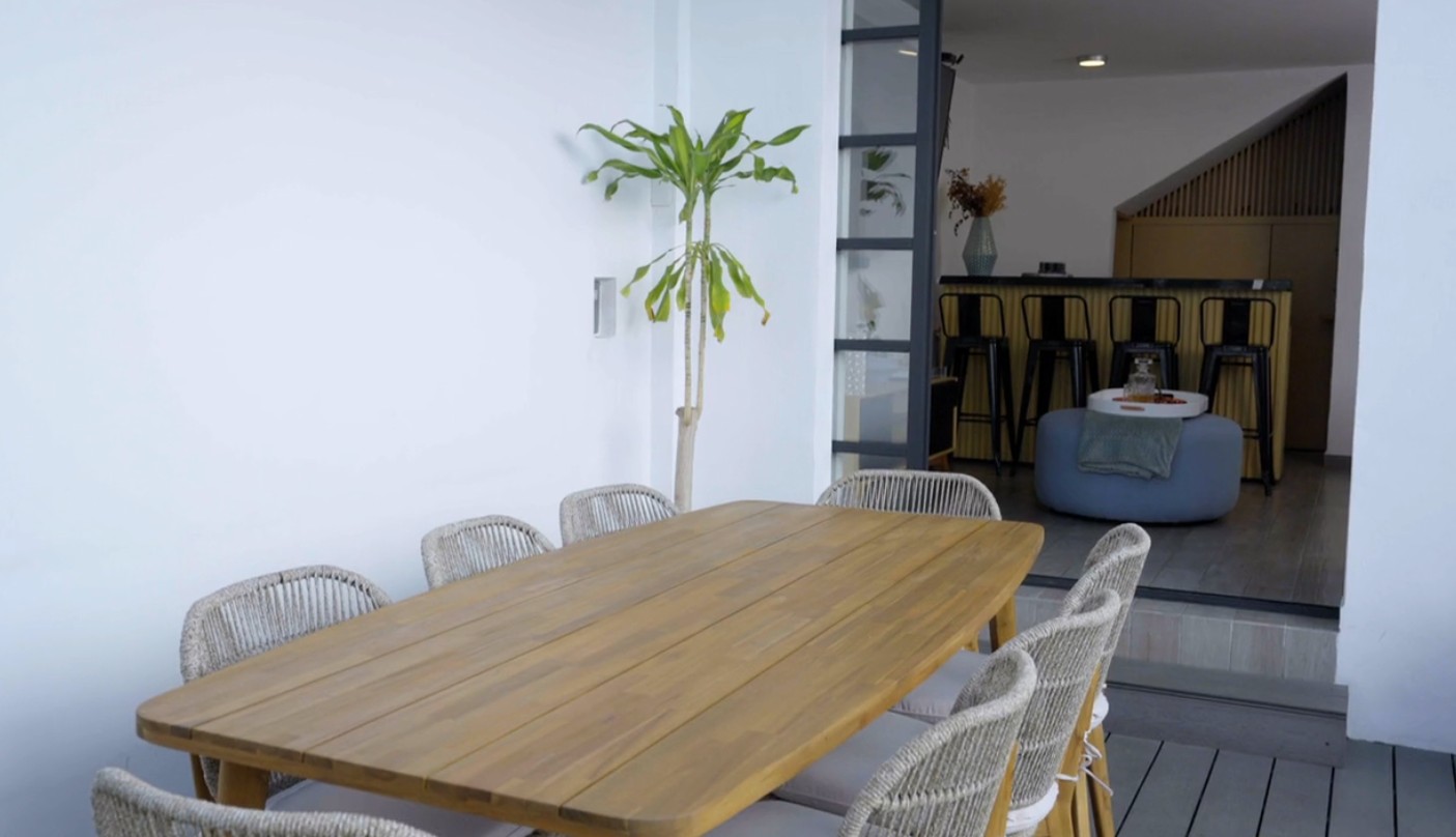Otro de los rincones destacados es su bar personal, ubicado en una terraza. Este espacio incluye una barra y mobiliario cómodo, convirtiéndose en el lugar ideal para relajarse o convivir con amigos.