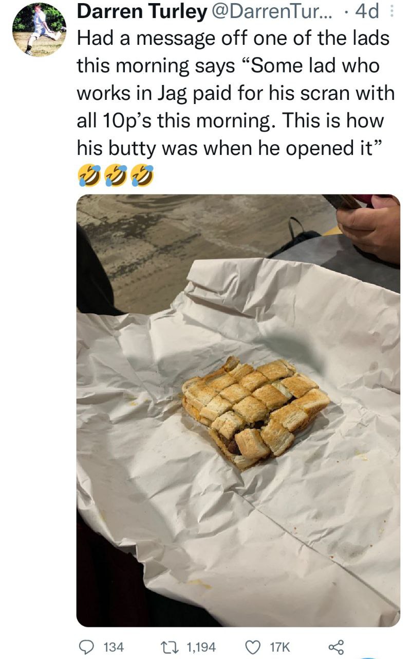 "Un muchacho que trabaja en Jaguar pagó su comida con monedas de 10 peniques esta mañana. Así era su comida cuando la abrió", decía el tuit con emoticones de risa.