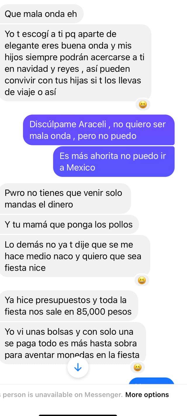 A pesar de que tenían años sin verse, Araceli le pidió a Aidé que le mandara el dinero desde Estados Unidos para pagar la fiesta, aunque ella no asistiera, y que su mamá le pusiera unos pollos de su rosticería.