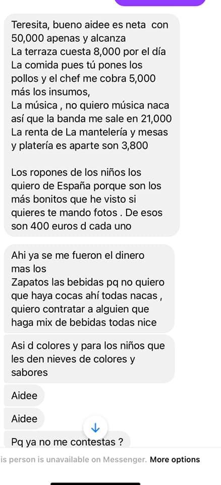 Aidé le ofreció poner 5 mil pesos para su fiesta y que buscara a otra madrina, pero su amiga insistió en que necesitaba el dinero para rentar una terraza, contratar a una banda, un chef, y comprar ropones de España para sus hijos, pues no quería cosas “nacas” en su fiesta.