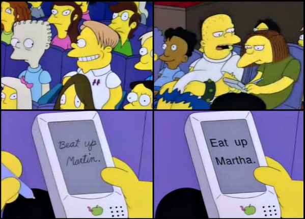 En 1994 Los Simpson predijeron los autocorrectores de los teléfonos y los problemas que causarían. En un capítulo Doph, uno de los brabucones de la primaria Springfield, escribe en su celular con logo de manzanita “golpear a Martín”, pero el corrector pone “comer a Marta”.