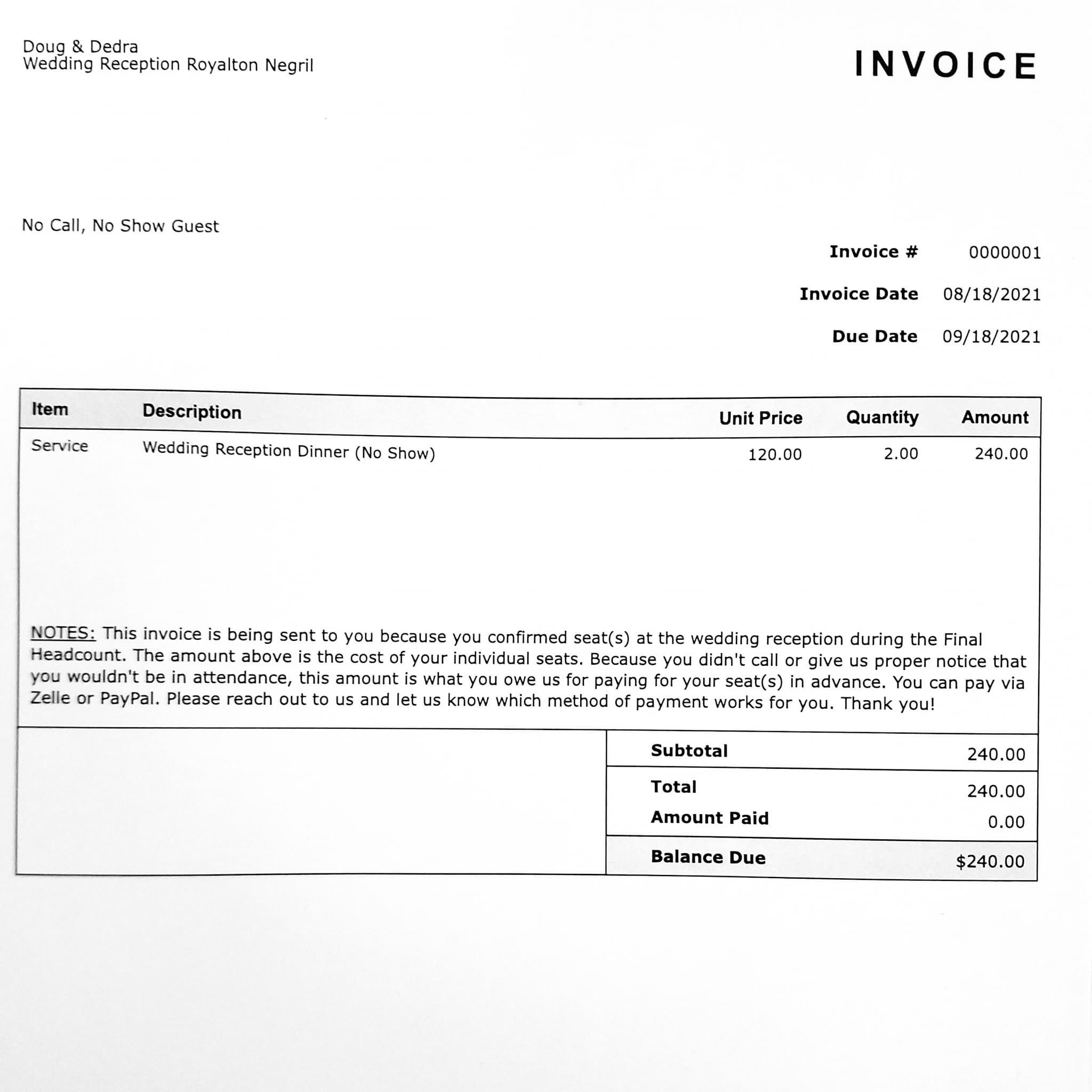 "Esta factura se debe a que confirmaste tu asistencia a la boda durante el último recuento. El importe es el coste del cubierto. Como no llamaste ni avisaste de tu ausencia, es la cantidad que nos debes. Puedes pagar a través de Zelle o PayPall", se puede leer en la factura que enviaron a sus invitados.[caption id="attachment_76625" align="aligncenter" width="757"]