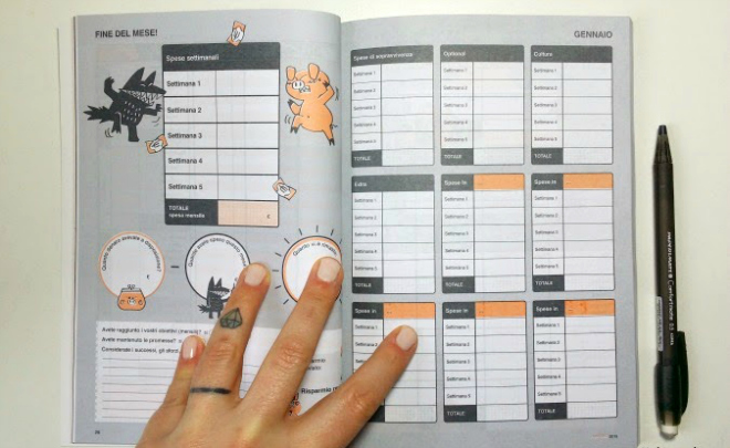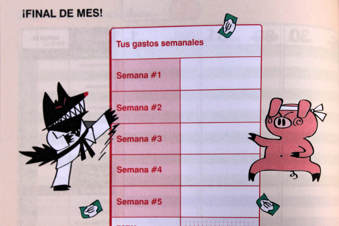 En clásica iconografía japonesa, el cerdito representa los ahorros y el lobo los gastos. Al final de cada mes, el libro te pregunta si lograste llegar a tu meta de ahorro y te hace recomendaciones para no volver a gastar en cosas irrelevantes.