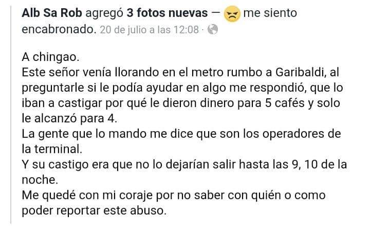 Un usuario de Facebook compartió la historia de un trabajadores de limpieza del Servicio de Transporte Colectivo Metro que se encontraba llorando por miedo a perder su trabajo ya que sus superiores le habían encargado 5 cafés y sólo le alcanzó para 4. De acuerdo al usuario, el trabajador viajaba a la estación Garibaldi, donde se encontraban sus jefes, también compartió con el usuario que como castigo lo dejarían salir hasta las 9 o 10 de la noche.