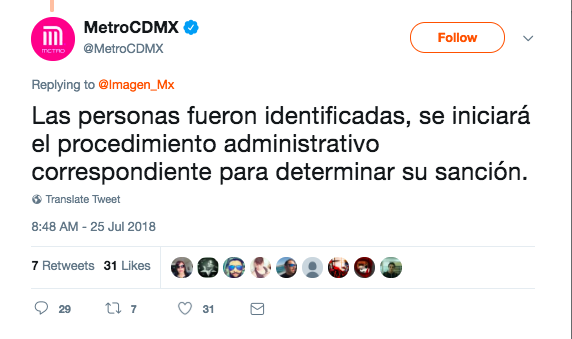 Su viralidad alcanzó tal nivel que el sistema de transporte reportó por medio de su cuenta de Twitter oficial que las personas ya fueron identificadas e iniciarían el proceso correspondiente.