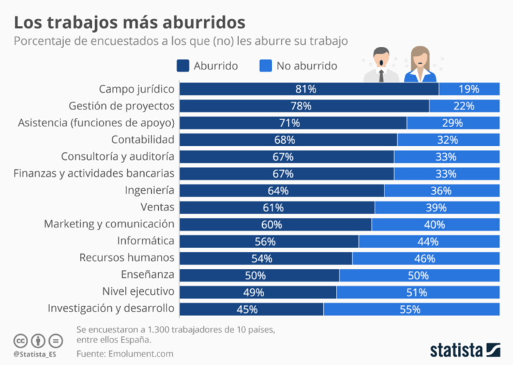 Según un estudio de Emolument realizado a 1,300 profesionistas en el mundo, al parecer toda profesión vinculada con aspectos legales es de las más aburridas que hay. Esto es debido a que dicha profesión requiere hacer actividades repetitivas y que implican estudios de casos y fallos. El estudio destaca que otras profesiones aburridas son las relacionadas con las finanzas y la contaduría, mientras que la más divertida es la investigación, debido al constante trabajo dinámico de la recopilación de datos que mantiene la motivación de los investigadores. Emolument considera que el problema del aburrimiento en el trabajo también traerá complicaciones a las empresas actuales ya que la lealtad de la generación millennial es cada ves más difícil de encontrar. El estudio también menciona que los trabajadores de nivel junior son los que más se sienten aburridos, con un 65%, mientras que los gerentes y los gerentes senior están empatados con un 64%.