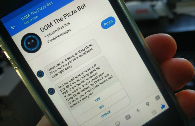 Dom es un bot que trabaja para Domino's Pizza y que 'vive' en Facebook Messenger para tomar tu orden de pizza, papas, refrescos y panes con kilos de canela y azúcar.