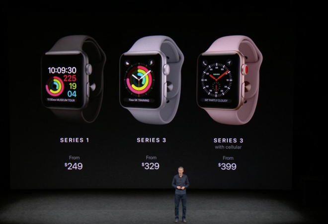 12:37 Los precios, el Apple Watch Series 3 con tecnología LTE te costará 399 dólares, mientras la versión sin celular estará en 329 dólares. El Series 1 baja de precio a 249 dólares. La fecha de lanzamiento es el 22 de septiembre, aunque no llegará a México de inicio.