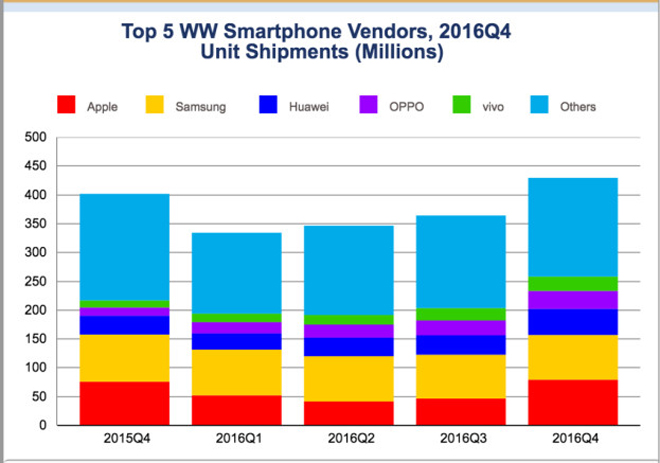 El análisis correspondiente al periodo octubre-diciembre del año pasado, reveló que pese a los temores de que el crecimiento del mercado de los smartphones se ha frenado, se comercializaron 428.5 millones de unidades, 6.9% más de lo registrado el último trimestre de 2016. El número total de smartphones vendidos en el año fue de 1.47 mil millones, anotando un récord de venta para los fabricantes de teléfonos móviles, aunque el incremento fue de apenas 2.3% respecto a los datos del año pasado. Para 2017, la firma espera que las ventas del iPhone crezcan debido a la expectativa por el modelo que lanzará Apple en el décimo aniversario del dispositivo. También se espera que la regiones de América Latina, Medio Oriente y África vuelvan a registrar aumentos. Aunque Apple y Samsung tienen el liderazgo en el mercado de los smartphones, los fabricantes chinos se mantienen en la batalla. Huawei se encuentra en el tercer puesto tras conquistar el 10.6% de participación de mercado, seguida por Oppo y Vivo.