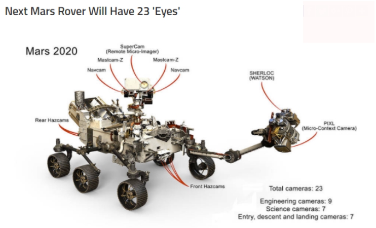 Mars 2020 de la NASA tendrá más ‘ojos’ que cualquier rover anterior. EL vehículo llegará a la superficie del Planeta Rojo dotado de 23 cámaras y la principal de éstas será capaz por de tomar, primera vez, fotos a una resolución de 20 megapíxeles, a color y 3D.