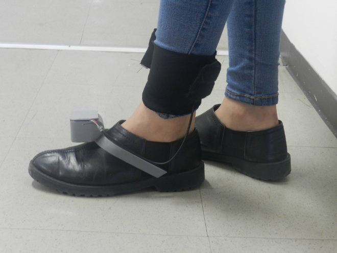 Ándalo trabaja a través de un sensor ultrasónico que se amarra a la rodilla del usuario, y esta va conectada a una pinza de plástico que se aferra al pie, donde también se encuentra otro sensor.