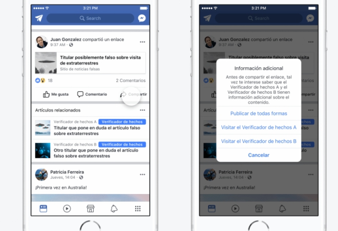 ‘Artículos relacionados’, debajo de la nota falsa en cuestión y si un usuario comparte una noticia falsa recibirá una notificación antes de completar la publicación con opción a leer la información complementaria de Verificado.