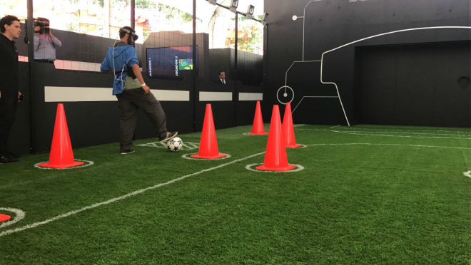 Otro reto consiste en colocarse dispositivos de captura de movimiento en puntos clave del cuerpo para sumergirse en un estacionamiento virtual en el que uno debe patear un balón de videojuego.