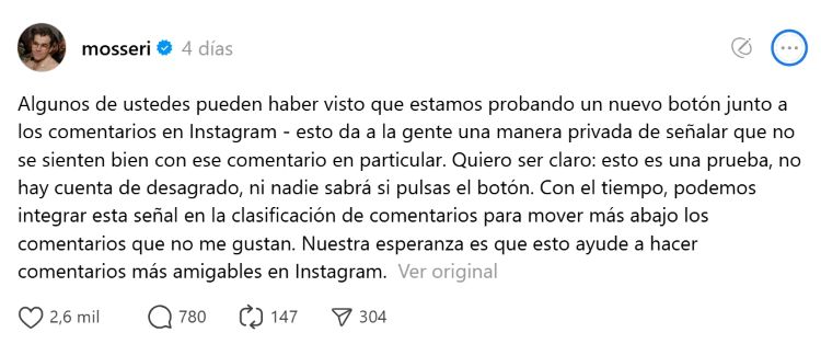 «Algunos de ustedes pueden haber visto que estamos probando un nuevo botón junto a los comentarios en Instagram. Esto da a la gente una manera privada de señalar que no se sienten bien con ese comentario en particular». Expuso Mosseri.