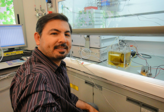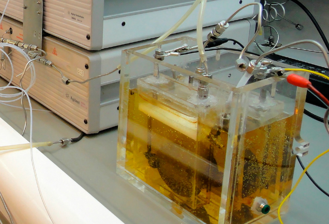 La celda que desarrolló Gabriel Luna Sandoval, doctor en ingeniería mecánica, es un tanque de acrílico y electrodos metálicos de aproximadamente 20 centímetros cuadrados, que funciona pasando corriente eléctrica para poder realizar el efecto de electrólisis, y así separar el hidrógeno y el oxígeno.
