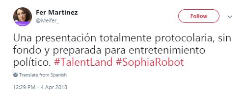 El robot con inteligencia artificial dijo -en inglés- que su misión es ayudar a los humanos, que está a favor de la igualdad de oportunidades para hombres y mujeres, habló sobre la responsabilidad de ser considerda como ciudadana en Arabia Saudita y mencionó que su desafío principal es entender las emociones humanas y entablar conversaciones.
